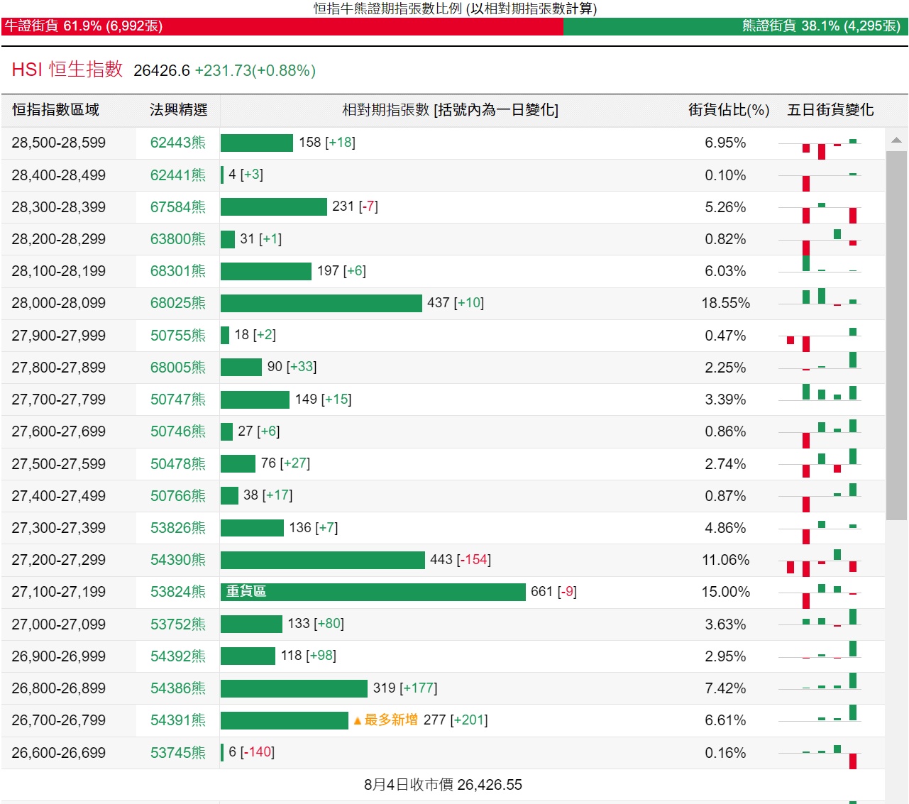 法兴恒指牛熊证街货分布图中的数据显示,熊证街货重货区在27,100-27,199区间,该区间最新熊证数量为661张,较上一交易日减少9张;最多新增在26,700-26,799区间,该区间最新熊证数量为277张,较上一交易日增加201张。