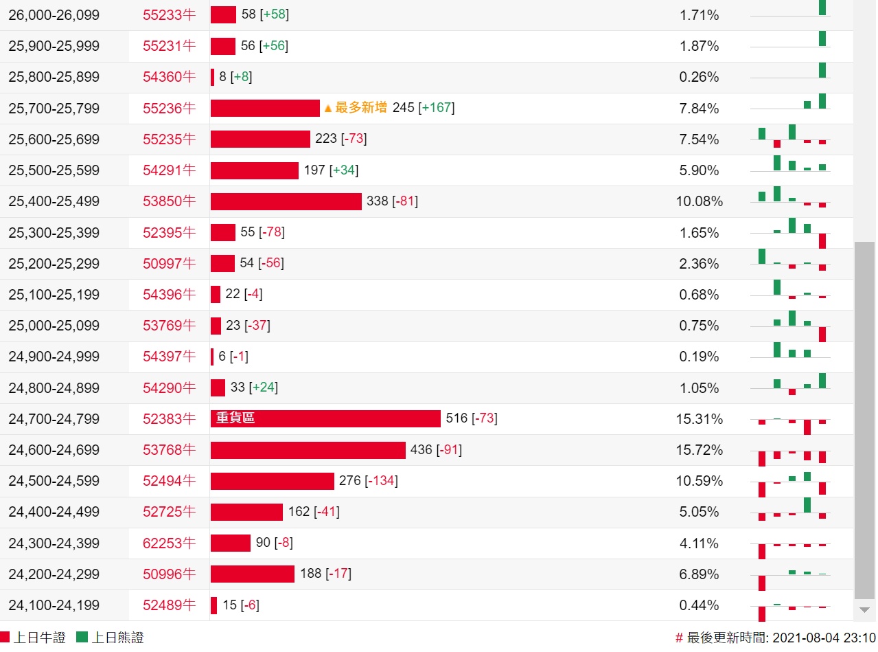 牛证街货重货区在24,700-24,799区间,该区间最新牛证数量为516张,较上一交易日减少73张;最多新增在25,700-25,799区间,该区间最新牛证数量为245张,较上一交易日增加167张。