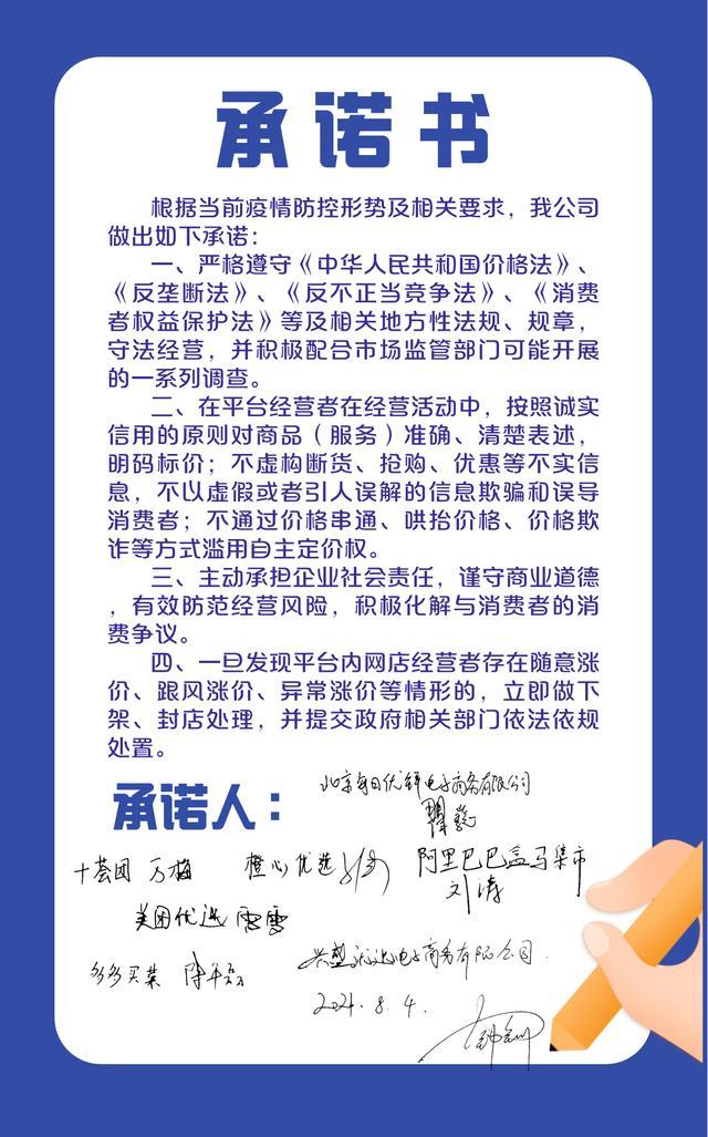 7家社区团购经营者签署了《承诺书》,承诺将会主动承担企业社会责任,谨守商业道德,有效防范经营风险,积极化解与消费者的消费争议。一旦发现平台内网店经营者存在随意涨价、跟风涨价、异常涨价等情形的,立即做下架、封店处理,并提交政府相关部门依法依规处置。