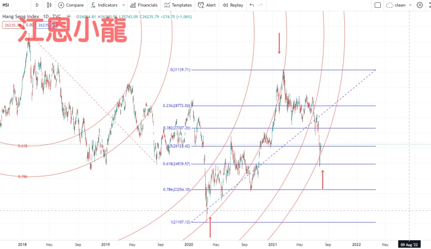 恒指我们以线性回归信道去看,我们发现仍有一点空间可以跌。而我们发现恒生指数过去几次大跌,都是以0.618/0.786的黄金比率进行。如果恒指0.618=24900,0.786即是23200点左右。跟线性回归信道结论差不多。即是如果恒生指生再下跌,那下一个目标就是23200左右。留意一下立秋8月7日前后的时间,会否是这一浪反弹的拐点。