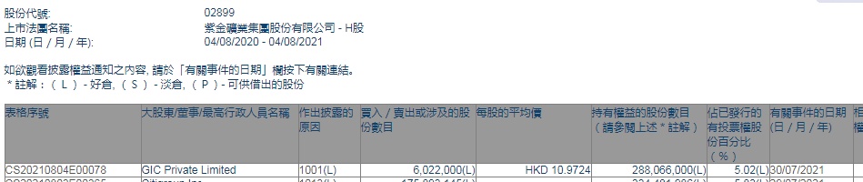 智通财经APP获悉,香港联交所最新资料显示,7月30日,GIC Private Limited增持紫金矿业(02899)602.2万股,每股作价10.9724港元,总金额约为6607.58万港元。增持后最新持股数目约为2.88亿股,最新持股比例为5.02%。