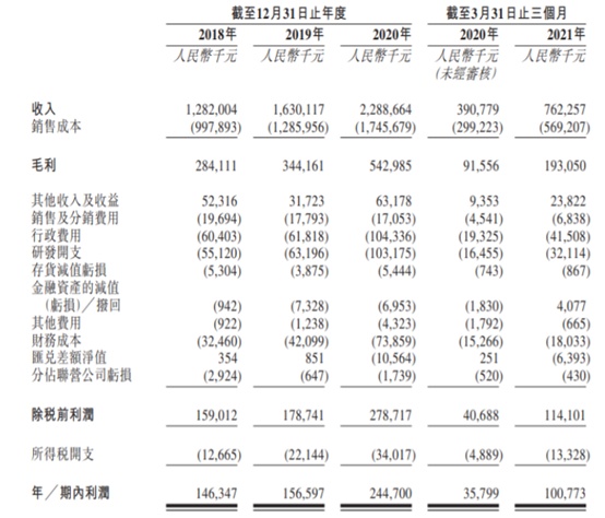招股书显示,金力永磁的几乎全部收入来自销售高性能钕铁硼永磁材料。2018-2020财年及2021年一季度,公司产生的总收入分别为12.82亿元(人民币,单位下同)、16.3亿元、22.89亿元及7.62亿元。相应期间,公司的净利润分别为1.46亿元、1.57亿元、2.45亿元及1.01亿元。其中,公司今年一季度净利润同比增加约181.5%。