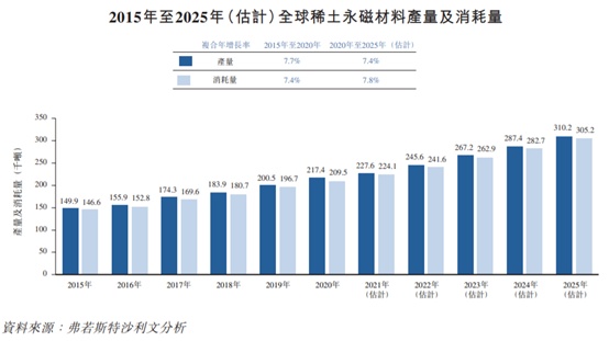 从市场空间来看,随着世界对全球气候变化的共识导致碳减排成为环境保护的关键方面,中国也计划分别于2030年及2060年前实现碳达峰及碳中和。而稀土永磁材料在减少碳排放方面突显出固有优势,因此,稀土永磁材料(主要包括钕铁硼永磁材料)的全球消耗量由2015年的约14.66万吨增至2020年的20.95万吨并预期将于2025年进一步增至30.52万吨。