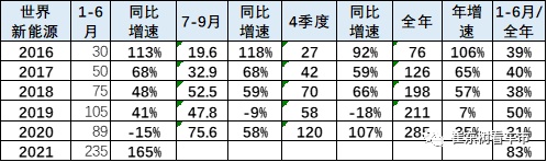 2019年的新能源车销量211万台,2020年新能源乘用车销量286万台,走势与2019年同期增35%。2020年世界新能源车走势前低后高明显。1-6月降15%,7-12月增86%。2021年1-6月呈现加速上升态势,由于去年6月的欧洲疫情严重,因此低基数下的增长更强。2021年1-6月新能源车销量达到235万台的增速165%是超预期的超强表现。