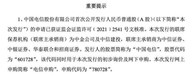 智通财经APP获悉,8月6日,中国电信股份有限公司(601728.SH)已签署首次公开发行人民币普通股(A股)的招股说明书,本次发行确定的发行价格为4.53元/股,对应的2020年摊薄后市盈率为20.18倍。预计发行人募集资金总额为470.94亿元,预计募集资金净额为467.12亿元。本次网下发行申购日与网上申购日同为2021年8月9日(T日),其中,网下申购时间为9:30-15:00,网上申购时间为9:30-11:30,13:00-15:00。