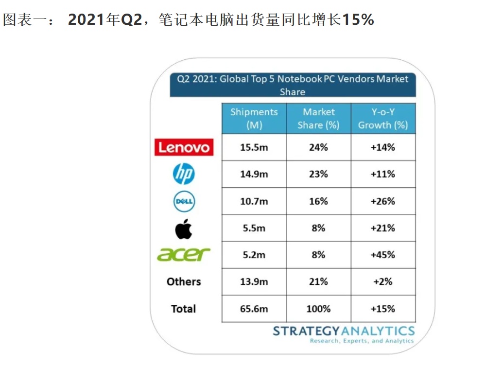 智通财经APP获悉,Strategy Analytics研究报告称,随着有些地方准备回到办公室或采用混合办公,2021年第二季度,全球笔记本电脑出货量达到6560万台,同比增长15%,但比2021年Q1的6820万台环比下降4%。商业客户准备返回工作岗位,并升级到更多的移动设备(台式机到笔记本电脑)是商业需求的主要驱动因素;联想(00992)笔记本出货量(批发)达到创纪录的1550万台,再次主导市场。这比去年同期的1360万台增长了14%。
