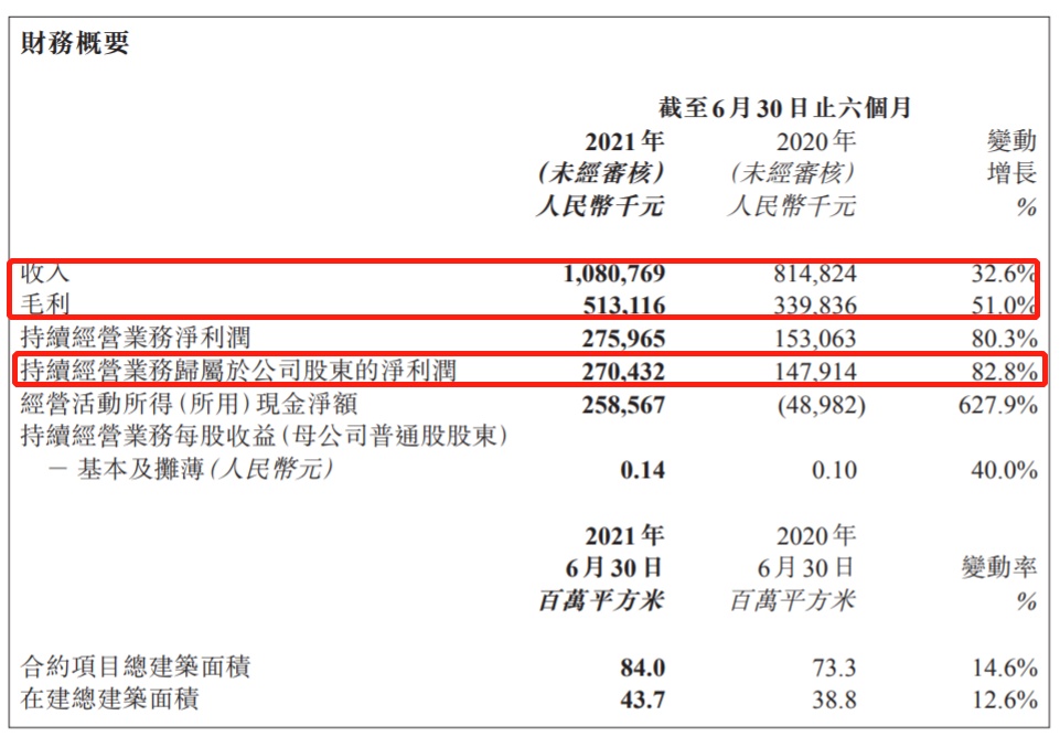 从财报披露的内容来看,截至2021年6月30日,公司于中国28个省、直辖市及自治区的96座城市拥有334个代建项目,合约总建筑面积84.0百万平方米,同比增长14.6%;在建面积为43.7百万平方米, 同比增长12.6%。同时,期内该公司的客户结构也愈发多元化:按管理总建筑面积看,该公司私营企业委托项目、国有企业委托项目、政府企业委托项目占比分别为35.7%、35.7%、21.7%,按当期在建面积看占比则分别为26.1%、43.9%、30.0%。