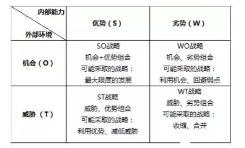 在现在的战略规划报告里,SWOT分析方法应该算是一个比较常见的分析工具,即对企业内外部条件各方面内容进行综合和概括,进而分析企业的优劣势、面临的机会和威胁的一种方法。其中“S”和“W”分别指企业的优势(Strength)和劣势(Weakness),“O”和“T”则分别是指企业所面临的发展机会(Opportunity)和威胁(Threats)。