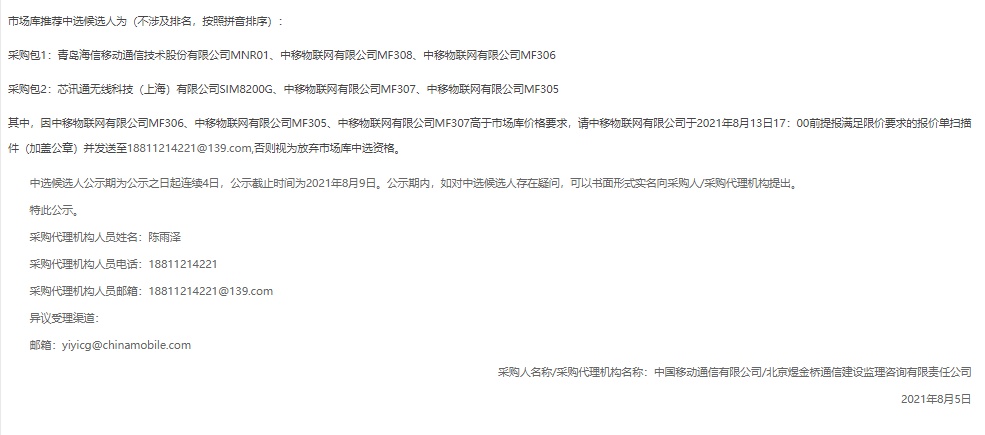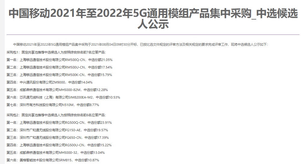 智通财经APP获悉,8月5日,中国移动官网公示了2021-2022年5G通用模组产品集采的中标结果。其中,移远、中兴(00763)、广和通等9家企业中标。