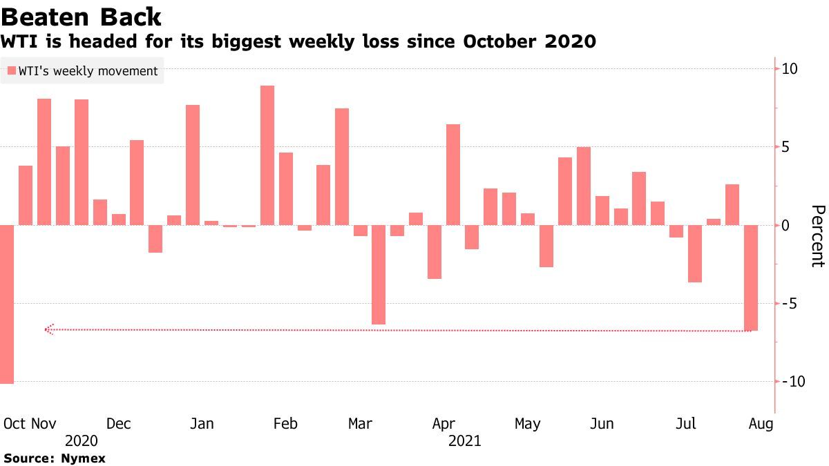 智通财经APP获悉,由于Delta变种病毒的传播导致人们对石油需求的持续复苏产生了怀疑,油价或将创下今年以来最大的单周跌幅。