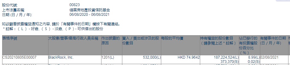 智通财经APP获悉,香港联交所最新资料显示,8月2日,贝莱德减持领展房产基金(00823)53.2万股,每股作价74.9642港元,总金额约为3988.1万港元。减持后最新持股数目约为1.87亿股,最新持股比例为8.99%。
