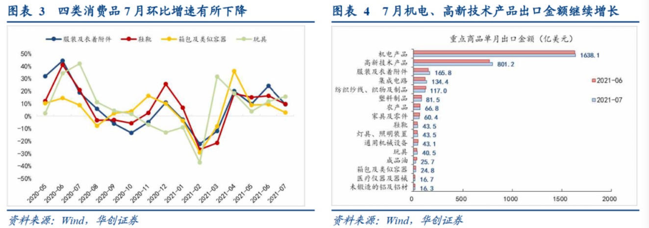 7月出口单月值持平6月仍显强势,生产资料和消费品是出口韧性的主要来源。其一,服装、鞋靴、家具等消费品出口环比仍然保持正增长,但增长边际趋缓;其二,高新技术产品、机电产品等出口大项,7月环比增幅亦收窄,但生产资料相关产品仍保持高增,表现强势;其三,防疫物资出口增速较上月有所放缓。