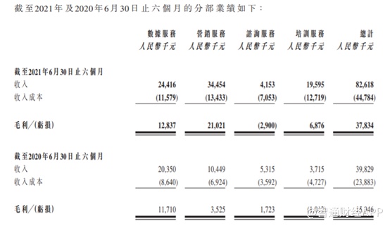 按照收入贡献划分,2021H1来自数据服务、营销服务、咨询服务和培训服务的收入分别为2442万、3445万、415万和1960万元,占比分别为29.6%、41.7%、5%和23.7%,同比分别增长20%、229%、-21.8%和427%,培训服务的收入占比显著提升。