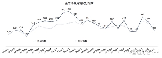 从市场募资、投资和退出情况看,截至今年Q2,全市场募资情况指数、投资情况指数和退出情况指数分别为128、185和229,其中募资和投资指数较去年高点显著下滑。而VC/PE100指数中,募资、投资和退出情况,也显示出同样的趋势,但是略好于全市场指数。