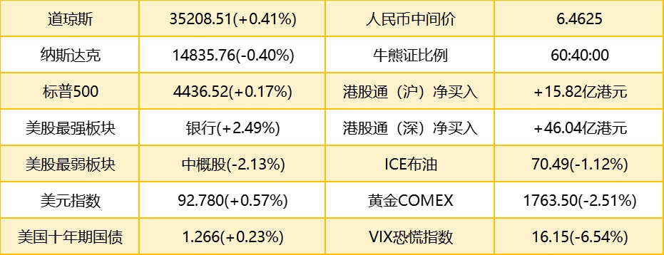 1. 隔夜美股截至收盘,道琼斯指数涨144.26点,涨幅0.41%,报35208.51点;标普500指数涨7.42点,涨幅0.17%,报4436.52点;纳斯达克综合指数跌59.36点,跌幅0.40%,报14835.76点。港股ADR指数下跌,按比例计算,收报26131点,下跌48.32点或0.18%。