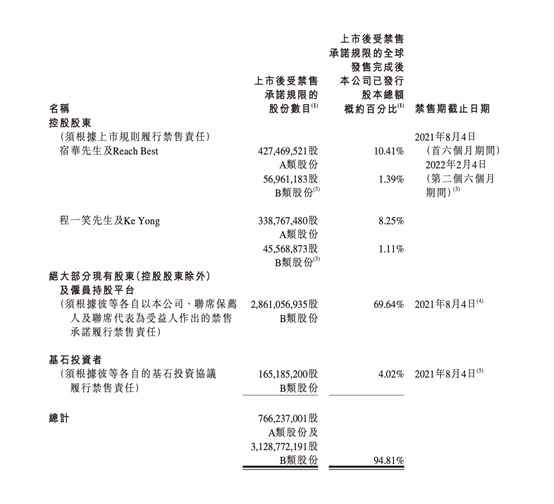 据了解,本次快手股票的解禁对象主要包括基石投资者、机构股东、持股高管以及员工等。按照文件披露,快手约有38.82亿股股票解禁,占发行后股本的94.81%,其中,快手CEO宿华及Reach Best持股比例为11.8%,控股股东程一笑及Ke Yong持股9.36%,基石投资者持股比例为4.02%。