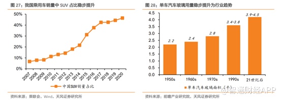 目前,单车玻璃用量趋势性提升。21世纪后单车汽车玻璃用量已提升至3.9-4.5平左右,较20世纪50年代提升1倍左右。背后核心驱动因素主要是乘车体验提升需求(扩大视野需求、天窗渗透率提升)、较轿车单车玻璃面积更大的SUV渗透率提升(如中国乘用车销量中SUV占比由2007年6.7%大幅提升至2020年的46.4%)。