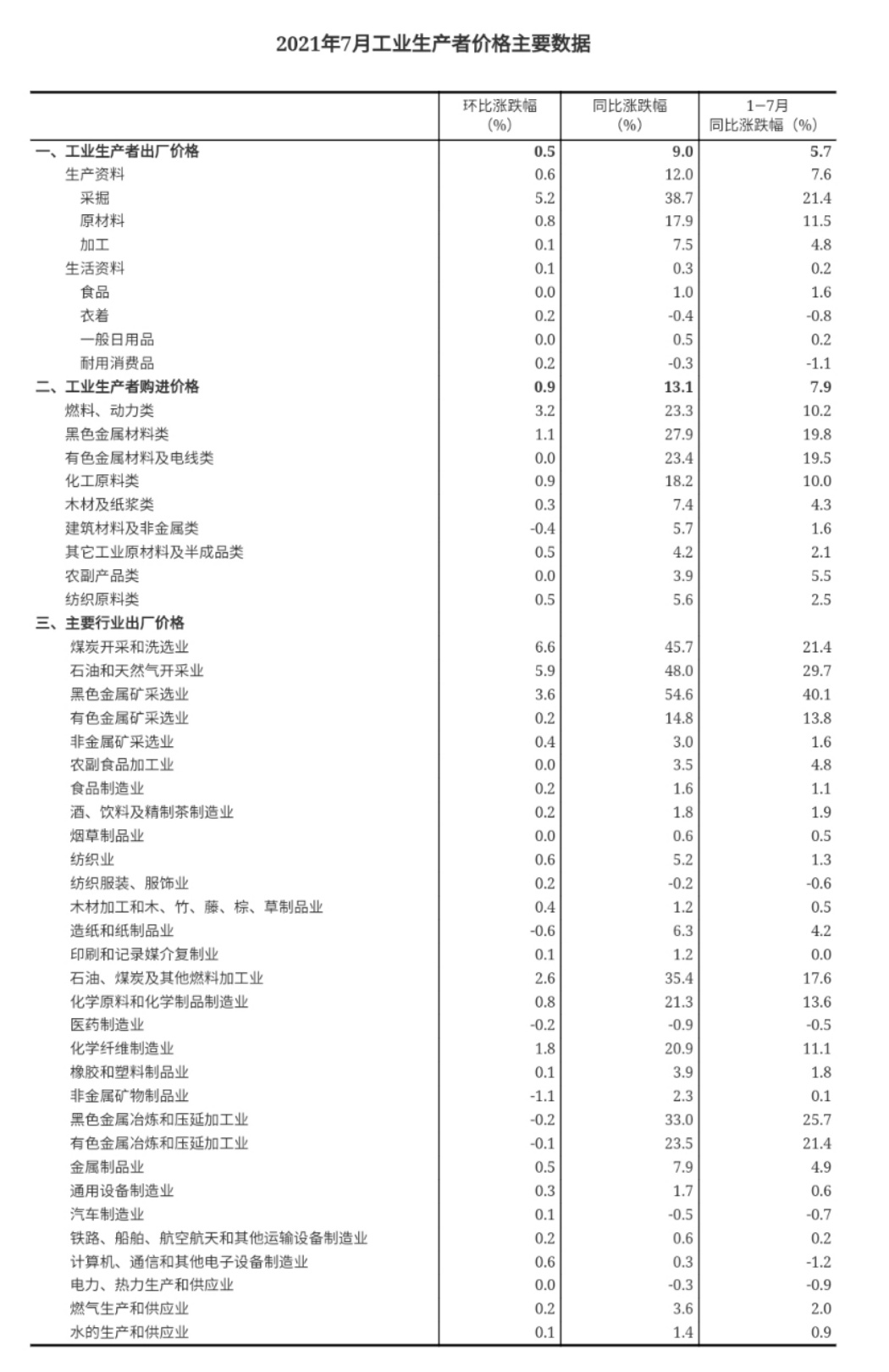 2021年7月份,全国工业生产者出厂价格同比上涨9.0%,环比上涨0.5%;工业生产者购进价格同比上涨13.1%,环比上涨0.9%。1—7月平均,工业生产者出厂价格比去年同期上涨5.7%,工业生产者购进价格上涨7.9%。