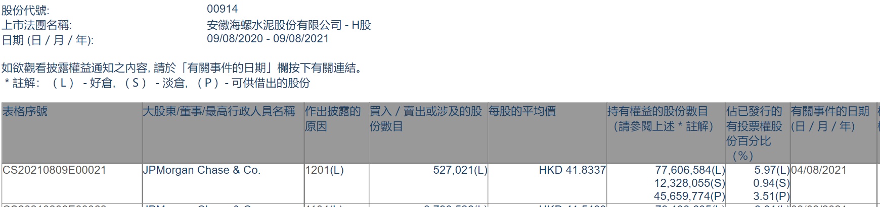 智通财经APP获悉,香港联交所最新资料显示,8月4日,摩根大通减持海螺水泥(00914)52.7021万股,每股作价41.8337港元,总金额约为2204.72万港元。减持后最新持股数目为7760.6584万股,最新持股比例为5.97%。