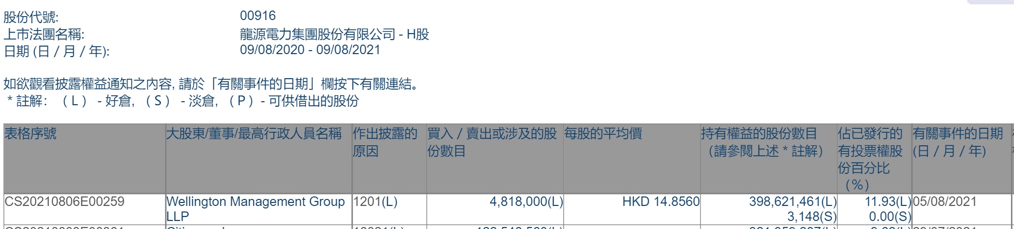 智通财经APP获悉,香港联交所最新资料显示,8月5日,Wellington Management Group LLP减持龙源电力(00916)481.8万股,每股作价14.856港元,总金额约7157.62万港元。减持后最新持股数目约为3.99亿股,最新持股比例为11.93%。