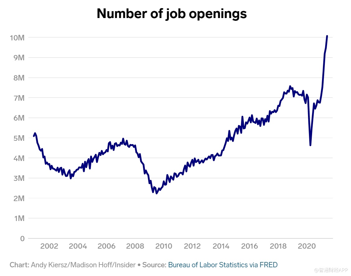 智通财经APP获悉,美国劳工部周一表示,随着美国劳动力市场继续从去年的经济停滞中复苏,职位空缺和劳工流动率调查(JOLTS)显示,6月份美国经济中的职位空缺数量跃升至1000多万,创下历史最高纪录。