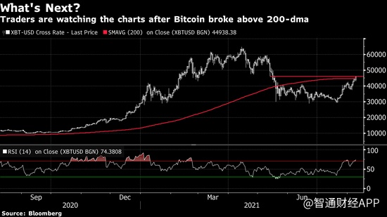 与此同时,交易员正在关注比特币走势,以寻找下一步可能走向何方的线索。该货币的14天相对强弱指标表明其已超买,但此次上涨突破了200天移动均线。许多人将50,000美元视为下一个关键门槛。