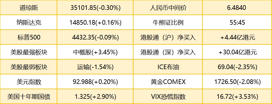 1. 隔夜美股截至收盘,道琼斯指数跌106.66点,跌幅0.30%,报35101.85点;标普500指数跌4.17点,跌幅0.09%,报4432.35点;纳斯达克综合指数涨24.42点,涨幅0.16%,报14860.18点。港股ADR指数上涨,按比例计算,收报26430点,上涨147.13点或0.56%。