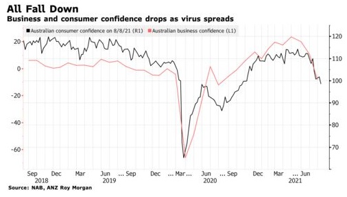 具有高度传染性的delta变种已经导致澳大利亚人口最多的东海岸地区实施封锁,悉尼目前已进入封锁的第七周。澳大利亚央行估计,在封锁期间,家庭支出将下降约15%,并预计本季度经济可能会收缩。