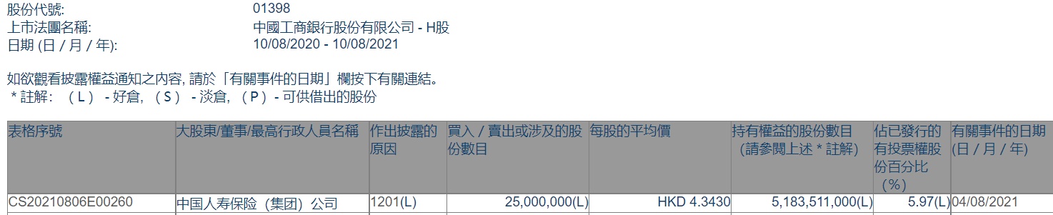 智通财经APP获悉,香港联交所最新资料显示,8月4日,中国人寿保险(集团)公司减持工商银行(01398)2500万股,每股作价4.343港元,总金额约为1.09亿港元。减持后最新持股数目约为51.84亿股,最新持股比例为5.97%。