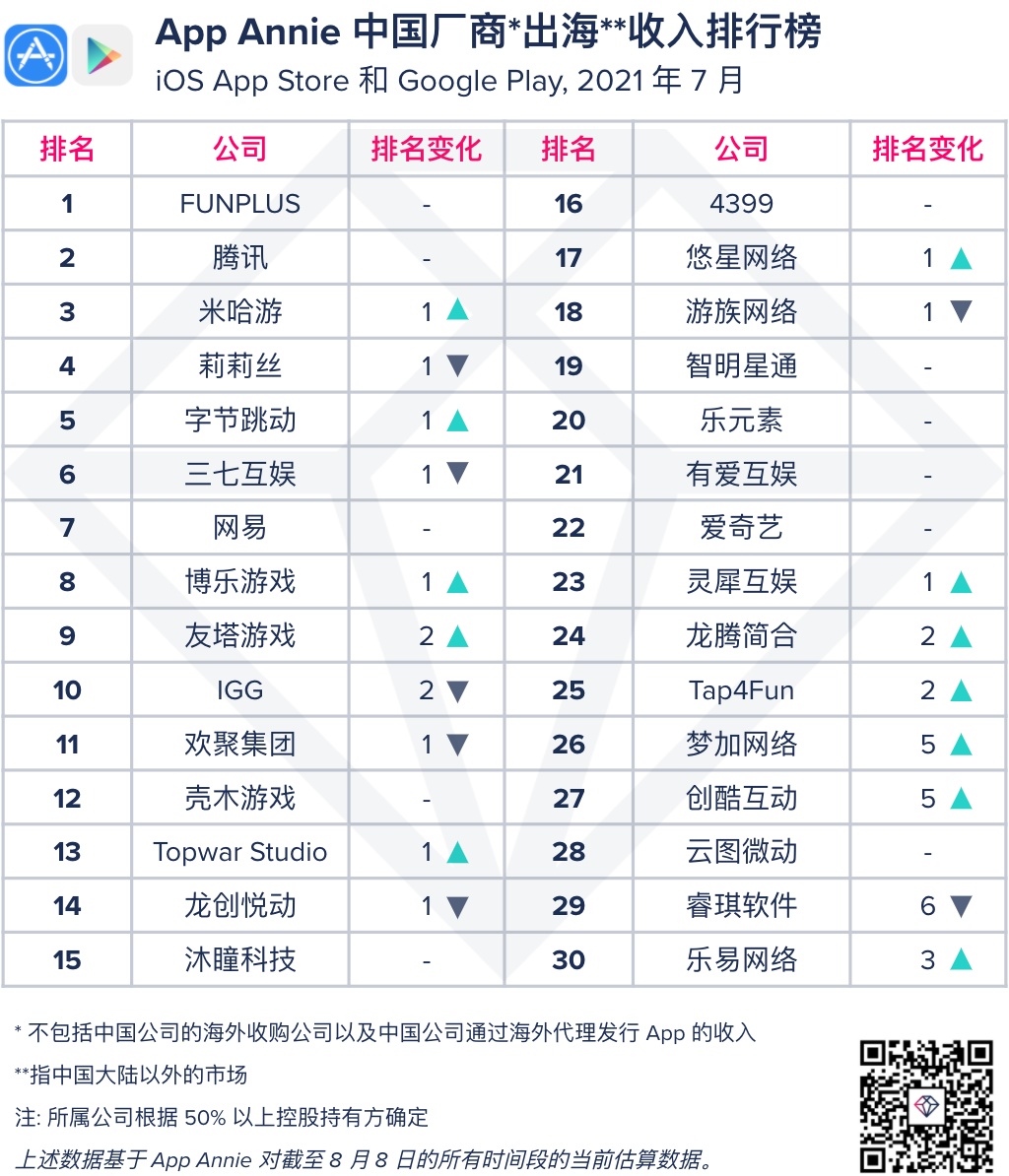 智通财经APP获悉,App Annie发布2021年7月中国厂商及应用出海收入30强榜单。数据显示,7月份,Fun
