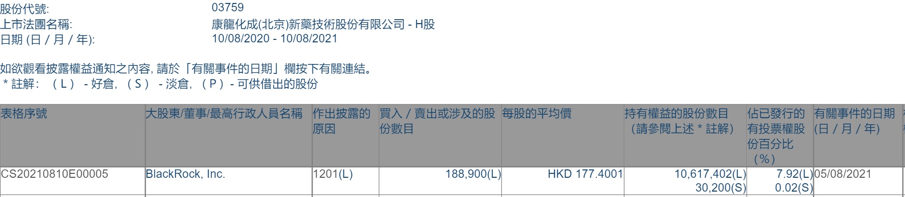 智通财经APP获悉,香港联交所最新资料显示,8月5日,贝莱德减持康龙化成(03759)18.89万股,每股作价177.4001港元,总金额约为3351.09万港元。减持后最新持股数目为1061.7402万股,最新持股比例为7.92%。
