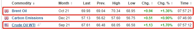 截至发稿,WTI原油涨1.70%,报67.61美元/桶。布伦特原油涨1.36%,报69.98美元/桶。