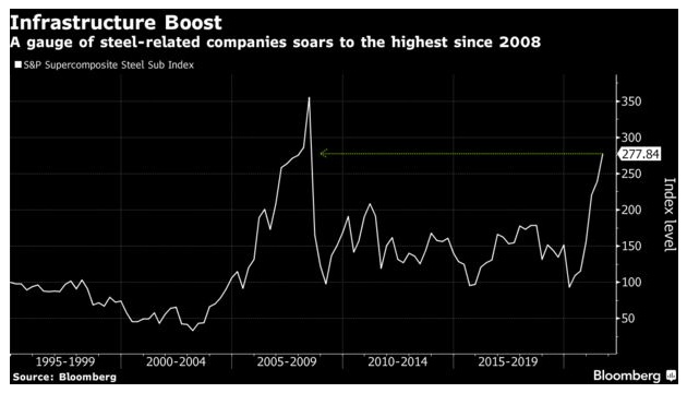 这项基础设施计划将代表美国几十年来在公共工程方面最大的一次支出增加。此次突破性的投票结果有助于延续钢铁制造商今年的涨势。在部分市场供应紧张的情况下,由于押注经济重新开放,以及重建铁路、公路和桥梁的支出将提振需求,钢铁制造商与金属价格一道上涨。