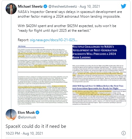 有媒体表示,马斯克的提议是为了回应美国宇航局监察部门的一份报告。监察部门是监管机构,负责审查宇航局是否存在欺诈和管理不善等行为的调查机构。这份报告是关于是研发一种新的舱外移动装置,非正式地称之为太空服。