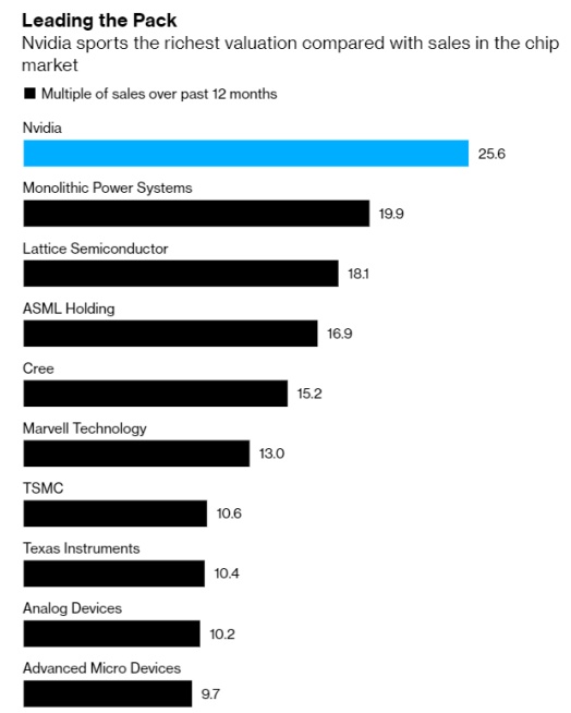 平均而言,SOX成份股在过去12个月的交易价格是其收入的8倍。基于此,Arm的估计市值仅为175亿美元。英伟达目前的股价是其过去12个月销售额的近26倍,是该指数中的最高比率。其次是 Monolithic Power Systems Inc.,其比率约为收入的 20 倍。