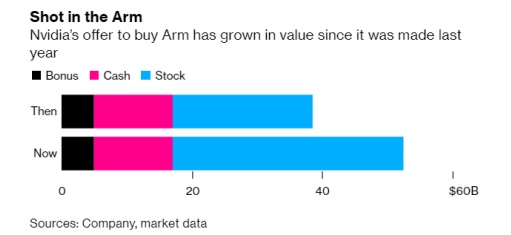 软银在2016年以310亿美元收购Arm,这意味着如果与英伟达的交易可以以当前规模获批,软银将获得大约60%的回报率。软银一直在出售其部分资产,并已经讨论过通过买断公众股东计划精简成为一家私营公司。