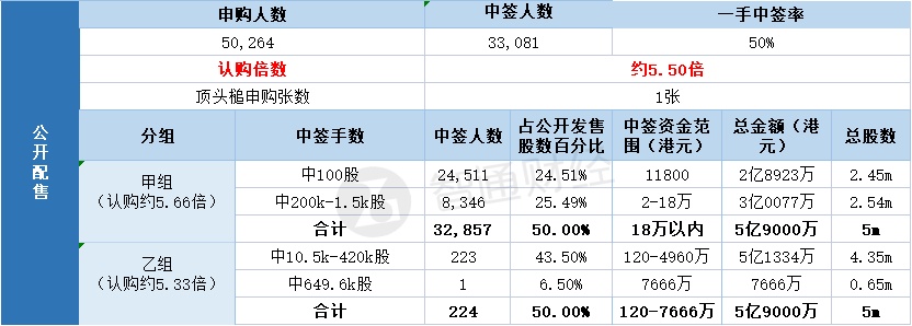 其中,公开配售申购人数50264人,一手中签率50%,认购倍数约5.50倍。