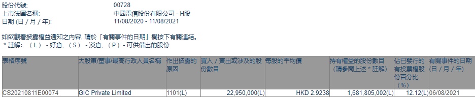 Limited增持中国电信(00728)2295万股,每股作价2.9238港元,总金额约为6710.12万港元。增持后最新持股数目为16.82亿股,最新持股比例为12.12%。