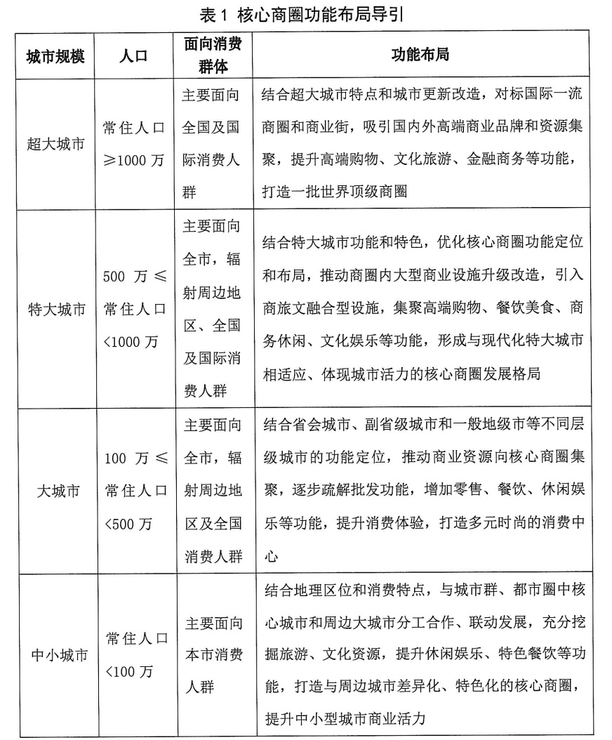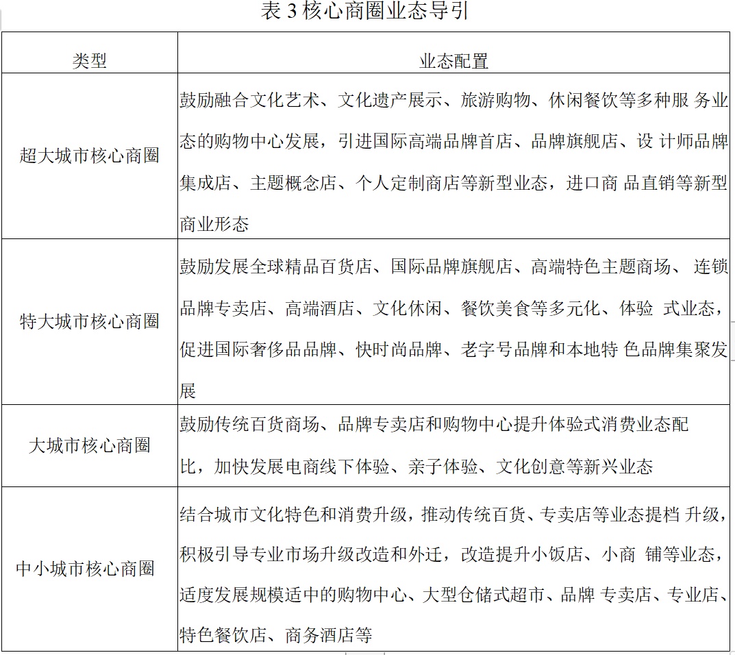 (一)核心商圈。根据城市规模和消费升级需要,合理确定城市核心商圈的业态结构和品牌档次,推动核心商圈传统商业业态转型升级,鼓励发展与商圈功能定位一致的新型商业业态和商业模式。大城市(包括超大、特大城市)限制发展大型超市、仓储式超市、商品交易市场、旧货市场、农贸市场等业态。