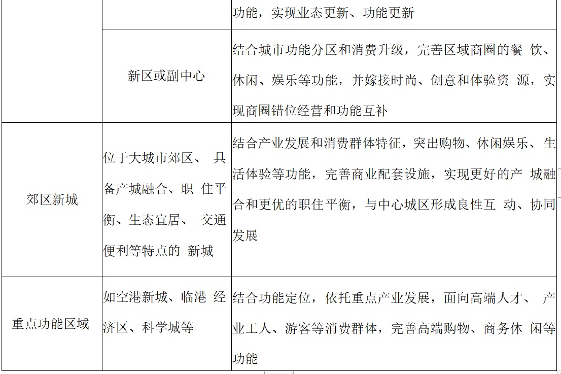 位于重点功能区域的区域商圈,要根据所在功能区域的产业特点、功能定位和面向的消费群体特征,合理确定商圈功能和空间形态,提升高端购物、商务休闲等功能。