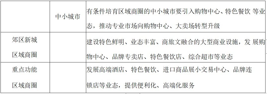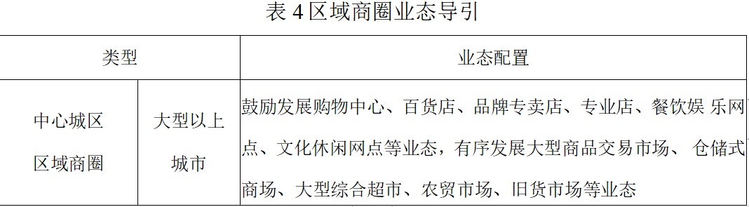 1.中心城区区域商圈。根据超大城市、特大城市、大城市和中小城市规模,合理确定不同城市规模的中心城区区域商圈业态配置要求。大城市(包括超大城市和特大城市)中心城区区域商圈业态配置要推动传统商业改造升级,引进新兴商业业态,有序发展大型商品交易市场、大型综合超市、旧货市场、农贸市场等业态。有条件培育中心城区区域商圈的中小城市,要提升零售、餐饮、休闲等功能,推动专业市场转型升级。
