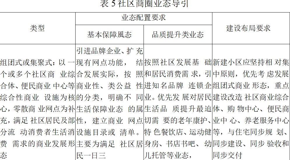 2.新建社区。坚持相对集中建设原则,根据社区用地规模、周边商业状况、不同半径范围内人口数量等因素确定社区商圈开发规模和布点方式。在大型新建居住区按照生活圈理念,结合公共交通枢纽设置社区商业综合体、邻里中心等。