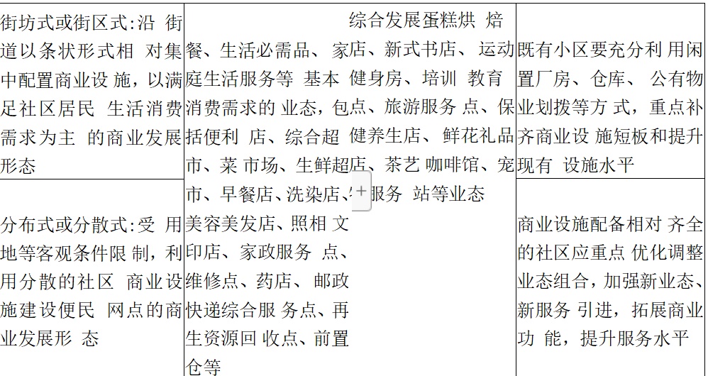 (三)社区商圈。因地制宜、分类指导,改造提升既有社区商业配套,高标准打造新建社区商圈,打造一刻钟便民生活圈,满足社区居民生活需要,提升居民生活品质。