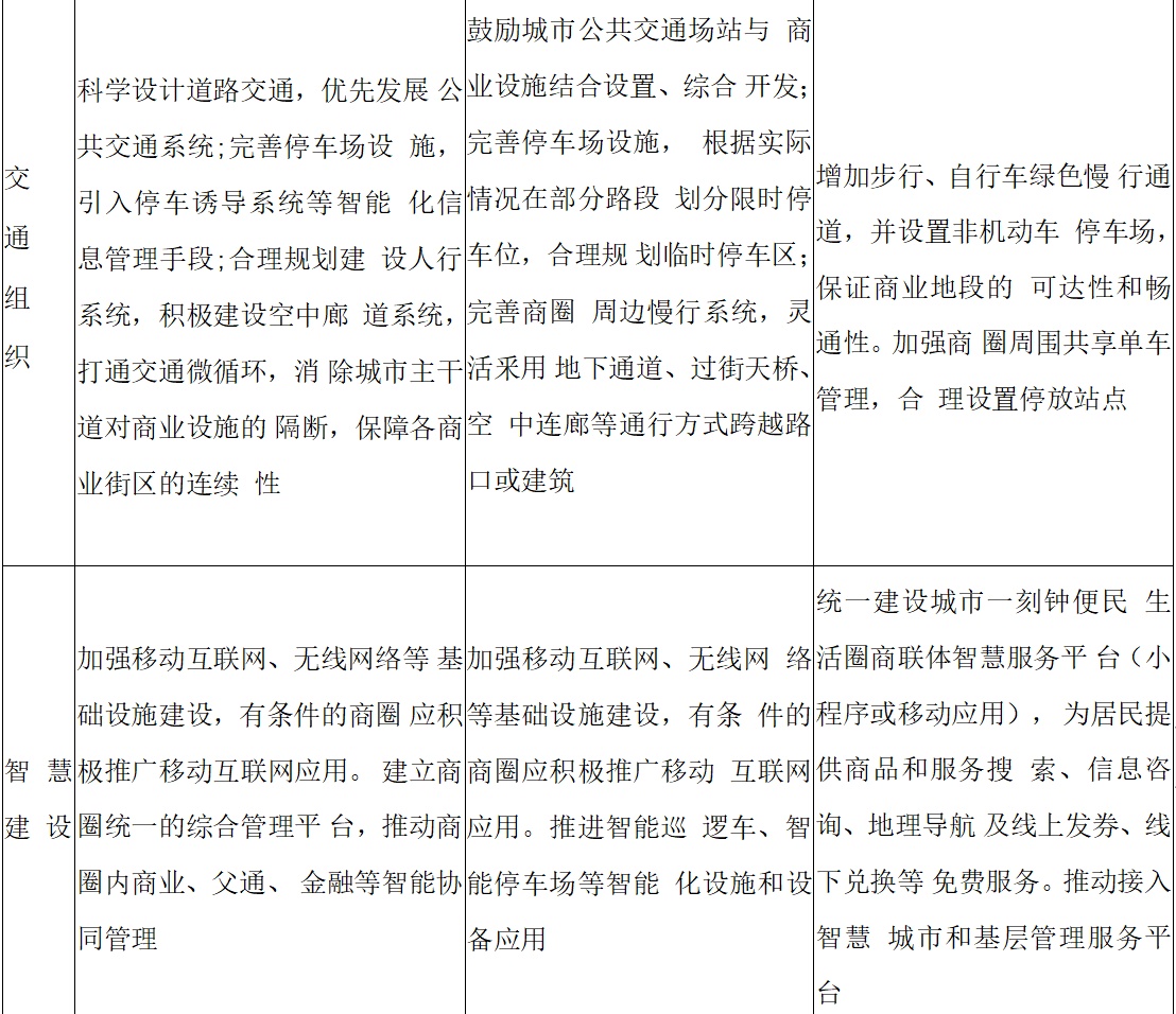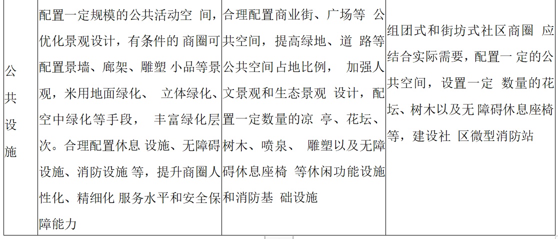 (四)公共设施。坚持“紧凑型”规划理念和建设方针,紧凑型布局商业设施、公共空间与设施,建设舒适休闲的室内空间和商业街等公共空间,集约利用土地。合理设置休息设施、标识设施、无障碍设施以及绿化景观、人文景观设施等,优化商业空间环境,提升商业形象。完善商圈消防安全保障,按照标准需求建设消防基础设施,满足灭火救援需要。