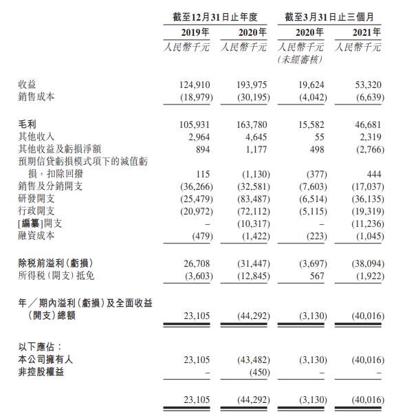 招股书显示,截至2019年、2020年12月31日止年度和截至2021年3月31日止三个月,先瑞达医疗的收入分别为元1.25亿元、1.94亿元和5332万元。该公司的研发开支由2019年的2547.9万元增加至2020年的8348.7万元,主要由于因进行临床前研究及临床试验而令产生的第三方承包开支、在研产品的持续开发导致耗材、在研产品的开发导致第三方谘询服务产生的顾问费等。
