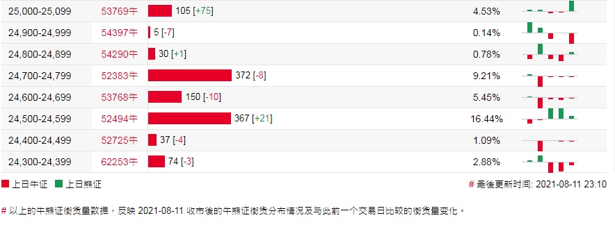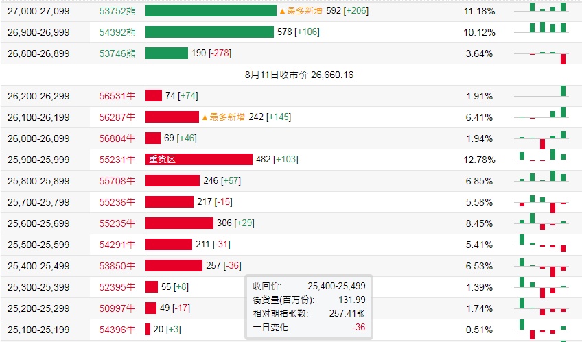 牛证街货重货区在25,900-25,999区间,该区间最新牛证数量为482张,较上一交易日增加103张;最多新增在26,100-26,199区间,该区间最新牛证数量为242张,较上一交易日增加145张。