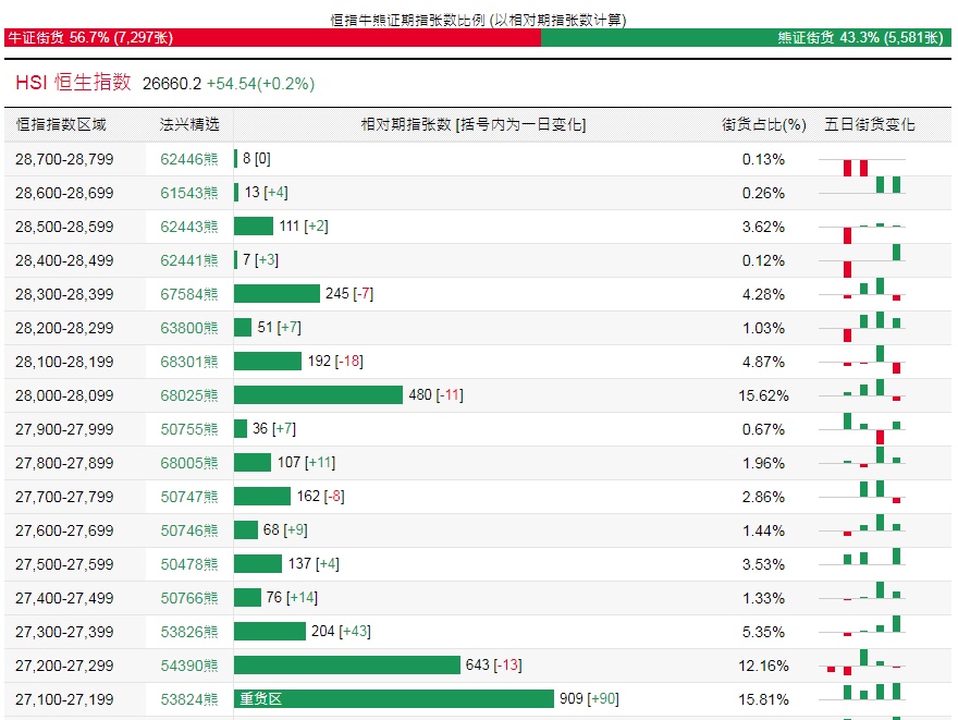 法兴恒指牛熊证街货分布图中的数据显示,熊证街货重货区在27,100-27,199区间,该区间最新熊证数量为909张,较上一交易日增加90张;最多新增在27,000-27,099区间,该区间最新熊证数量为592张,较上一交易日增加206张。