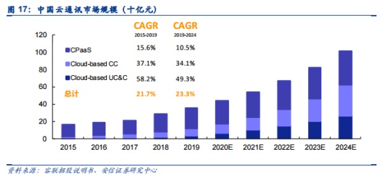 展望后市,据前述机构预判,基于云通信解决方案的市场规模有望延续高速增长势头。CIC预计,至2024年该市场有望达到千亿规模,2019年-2024年期间复合年增长率有望达到23.3%。