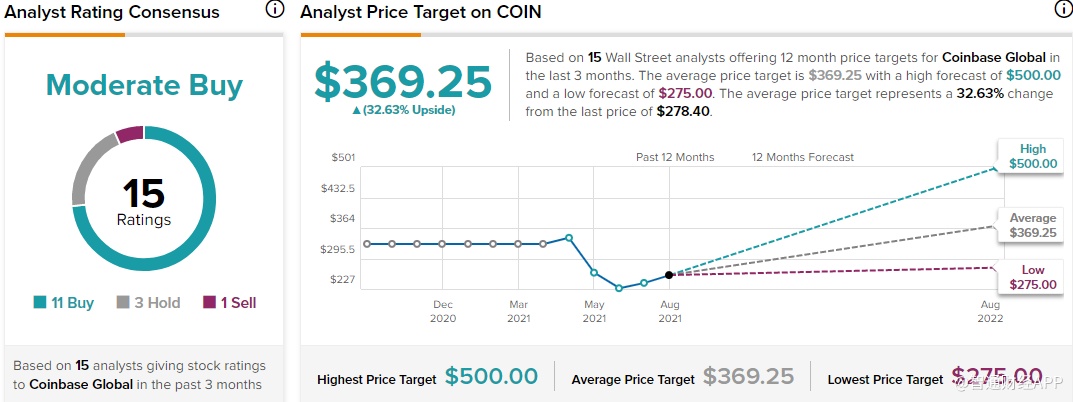 在TipRanks上,有11位分析师予Coinbase“买入”评级,3位予“持有”评级,1位予“卖出”评级,共识评级为“适度买入”,平均目标价为369.25美元,意味着较当前股价有33%的上涨空间。