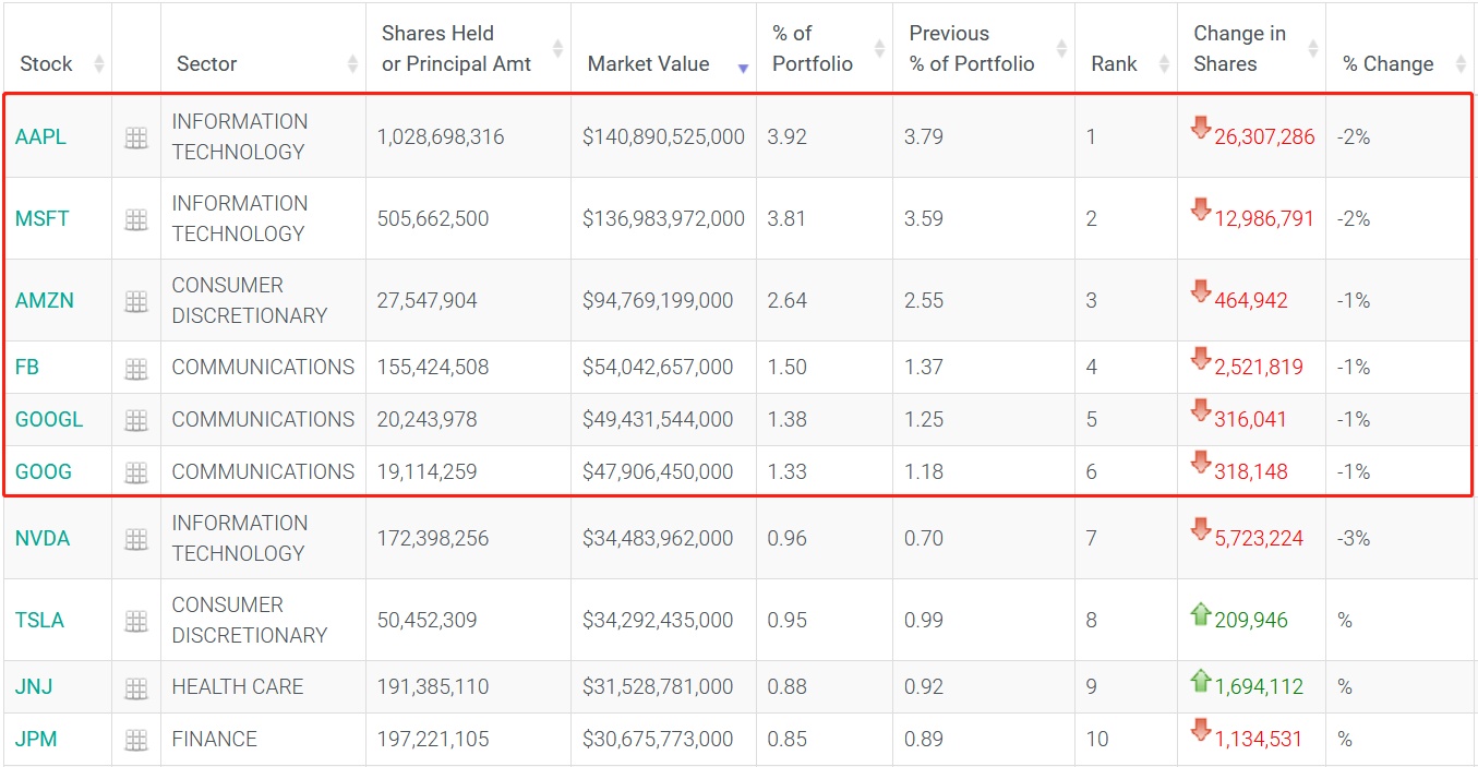 Facebook(FB.US)位列第四,占比达1.50%,上季度占比为1.37%;持仓约1.55亿股,较上季度持仓数量减少约252.18万股,目前持仓市值约540.43亿美元。